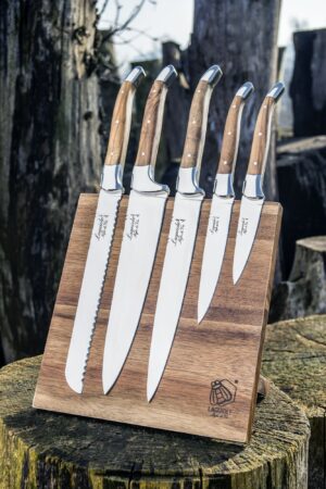 Het messenblok in de 5 messen incl messenblok Style de vie luxury line set is gemaakt van Acaciahout en heeft een magnetische trekking om de messen veilig op te bergen.