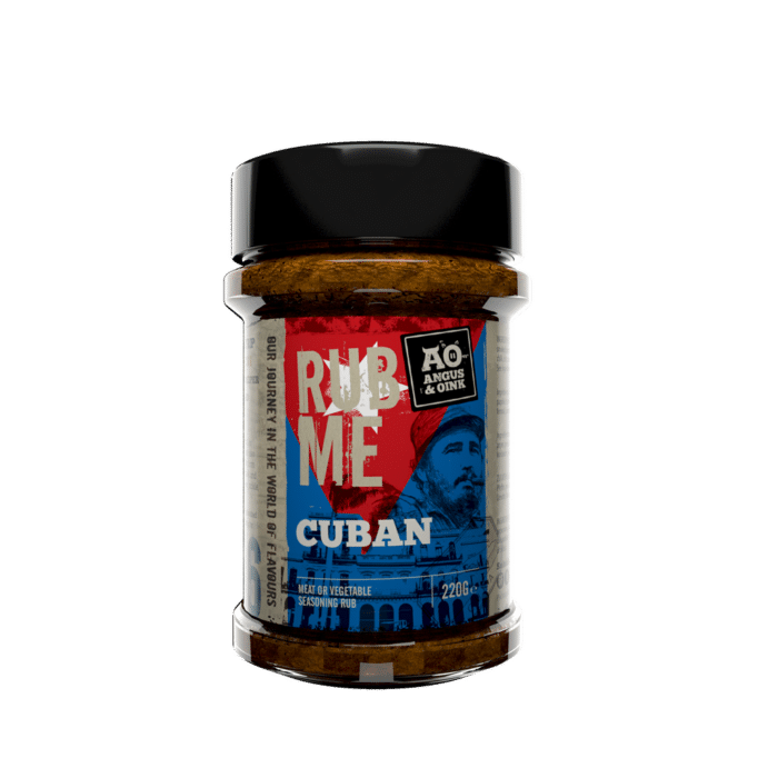 De ingrediënten van Angus & Oink Cuban zijn zout, suiker, selderij zout, zwarte peper, gerookte paprika, komijn, uienpoeder, sinaasappel, limoen, koriander, venkel en chili.