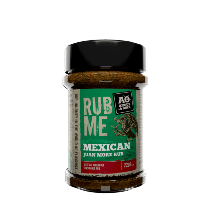 De Angus & Oink Mexican bevat zout, suiker, zwarte peper, uienpoeder, oregano, allspice, komijn, kruidnagel, ancho, chipotle chili, kaneel, limoen en selderijzout.