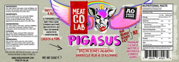 Angus & Oink Pigasus bevat zout, suiker, paprika, zwarte peper, selderijzout, chili, nootmuskaat, uigranulaat, knoflook, kurkuma, bietenpoeder en kaneel.