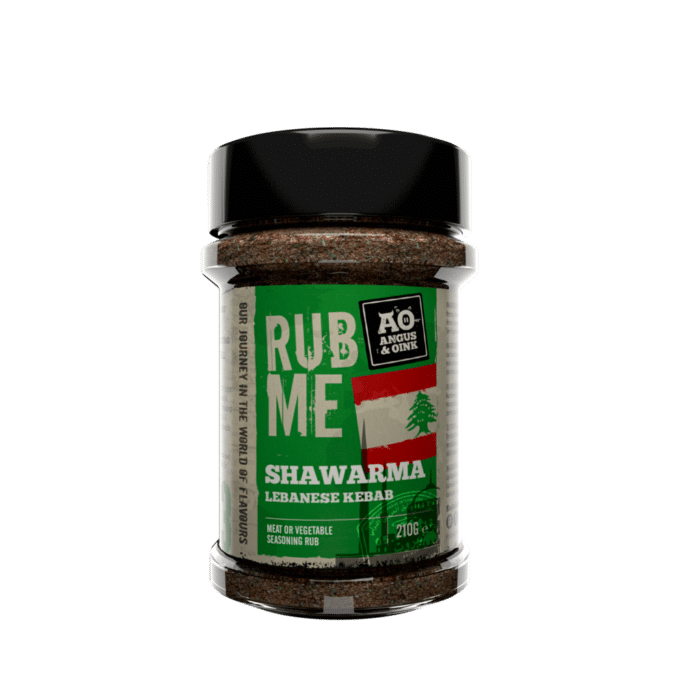 De Angus & Oink Shawarma bestaat uit zout, suiker, zwarte peper, kruidnagel, kardemom, venkel, komijn, steranijs, fenegriek, kaneel, nootmuskaat, gember, citroenpoeder, basilicum, kurkuma, zoete paprika, en peterselie.