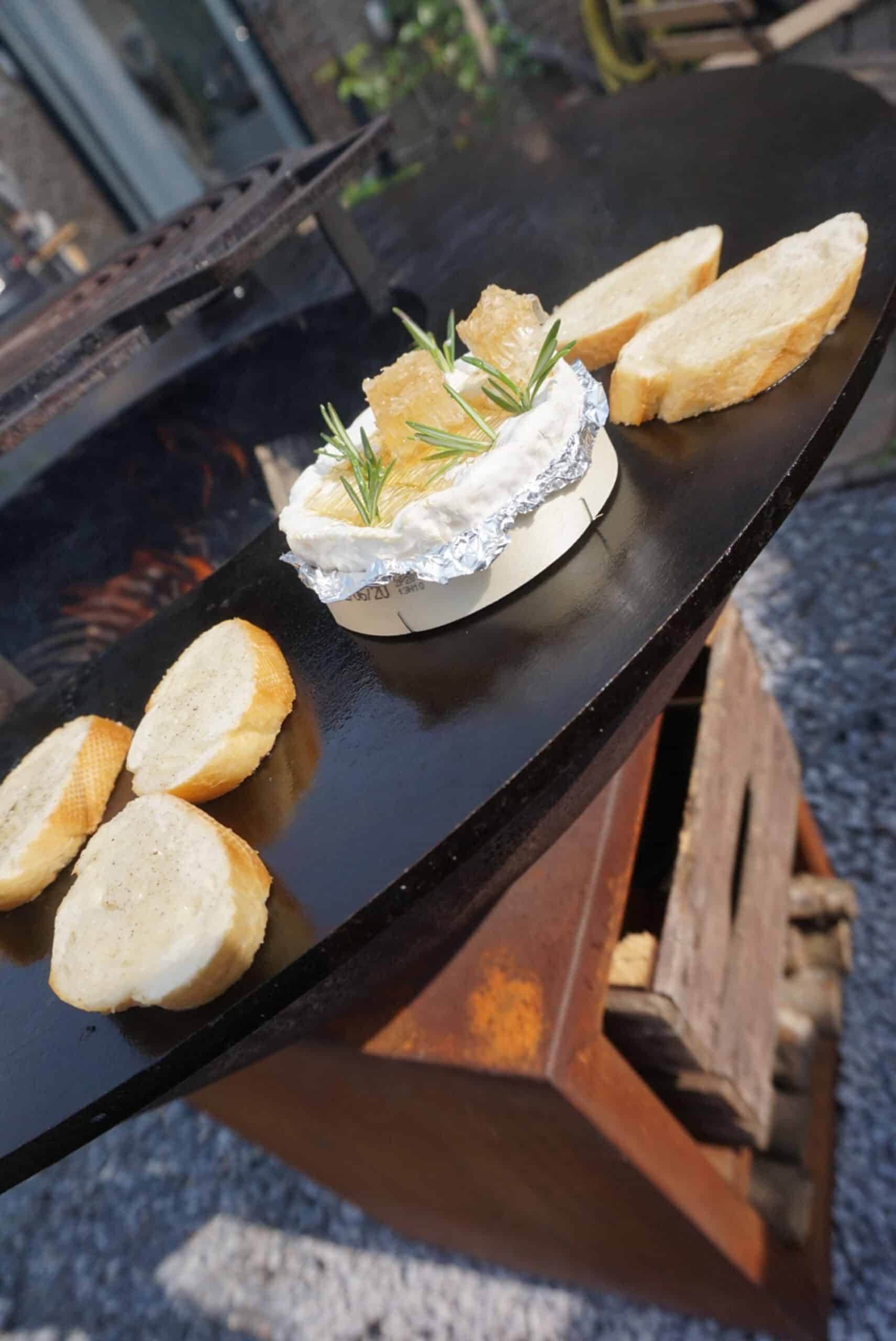 De sfeer van het vuur een goed wijntje in de hand daar hoort een mooie borrelsnack bij. Voor dit kaasje moet je wel even de tijd nemen maar dan kun je er ook nog lekker van genieten met vrienden. De smaken die we in dit recept gebruiken gaan mooi samen met een rode wijn of port. Het recept kun je natuurlijk ook prima maken in een kamado of andere BBQ met deksel. Gebruik dan een gietijzeren grillplaat.