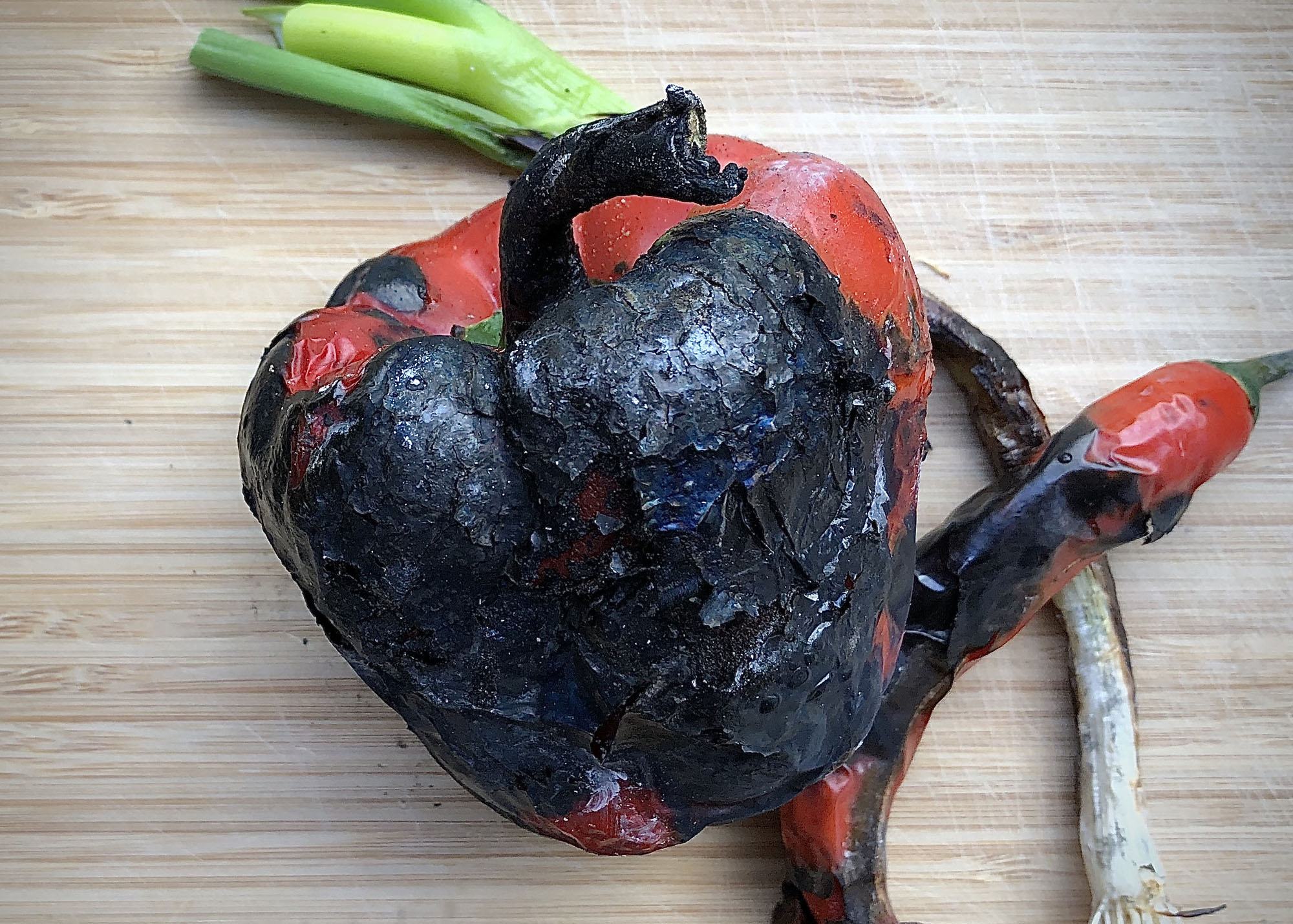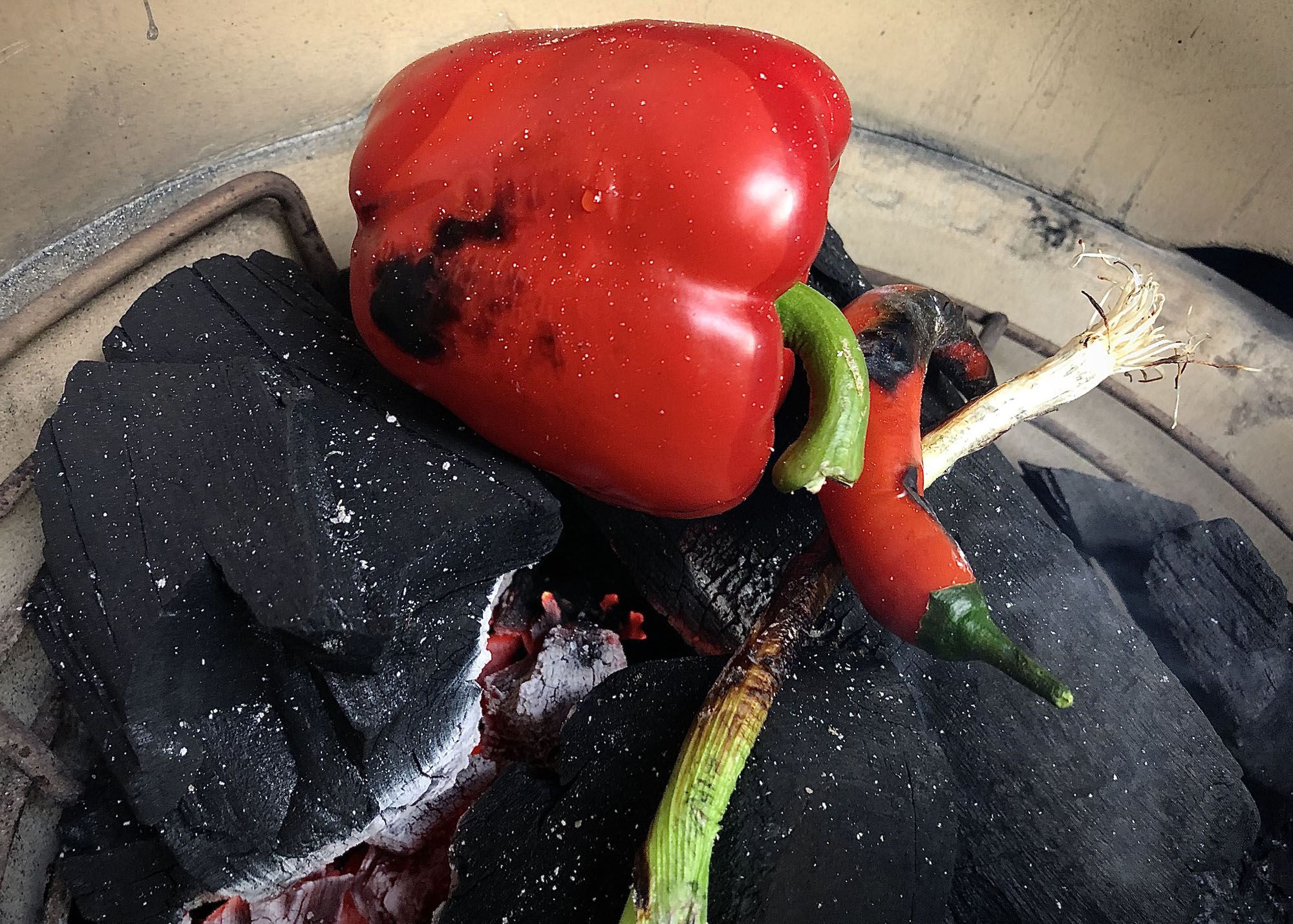 Leg de paprika, de rode peper en de bos-ui in je hotspot tussen de kolen en laat de buitenkanten volledig zwart blakeren. Let op! Bij de bos-ui gebeurt dit vrij snel, blijf er dus even bij. Draai de groenten regelmatig.