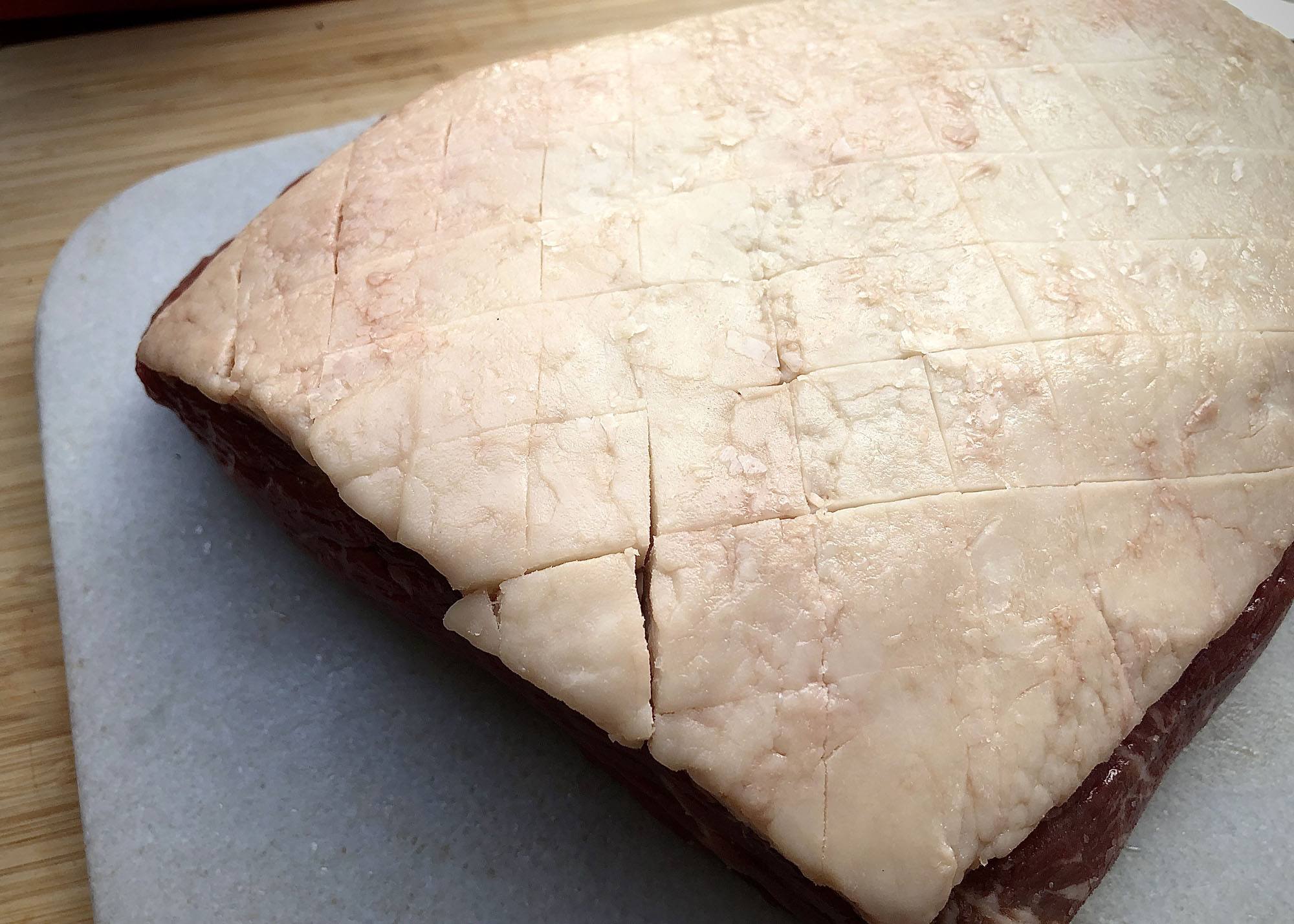 Haal de Picanha uit haar verpakking en dep even droog met een keukenpapiertje. Pak een goed scherp mes en snijd de vetkap in. Doe dit in een ruitvorm. Dit is om twee redenen slim om te doen: 1. het zout dat je erop strooit straks trekt dieper in de vetkap en heeft meer kans om het vlees smaak te geven en 2. Er is meer ‘oppervlak’ aan vet wat warmte krijgt waardoor deze beter smelt en zelfs uit kan bakken tot een krokant laagje op je Picanha. Klinkt goed toch?!