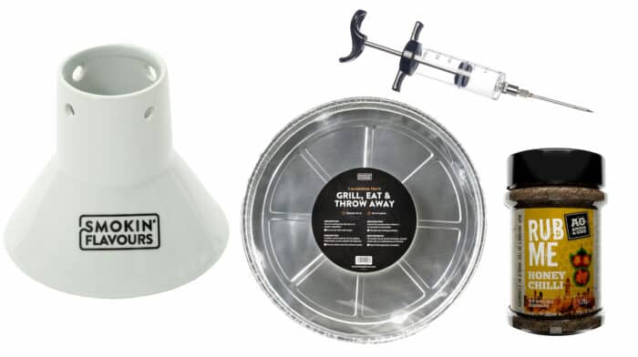 De Beer can chicken bundel is een set van diverse barbecue producten. Het bevat een Beer Can Chicken Sitter keramisch Smokin’ Flavours, Aluminium bakken wegwerp druippan rond 5 stuks Smokin’ Flavours, Angus & Oink Honey Chili van 200 gram en een Marinade injector Smokin’ Flavours.