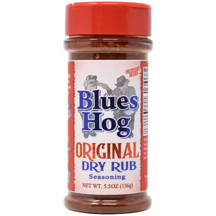 De Blues Hog Original Dry Rub Seasoning bevat paprikapoeder, zout, suiker, ui, chili en knoflook.