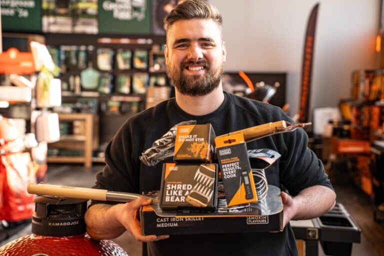 Als je serieus aan de slag wilt met je kamado, zijn er een paar accessoires die je BBQ-ervaring een stuk relaxter en makkelijker maken. Begin met hittebestendige handschoenen. Of je nou een gloeiend heet rooster moet verplaatsen of een gietijzeren pan uit de BBQ tilt, zonder goede handschoenen riskeer je gegarandeerd verbrande vingers. Een kernthermometer is ook een echte must-have. Hiermee voorkom je dat je steak uitdroogt of je kip vanbinnen nog half rauw is. Onze favoriet is de Meater 2+, deze verbonden met bluetooth en je kan direct vanaf je telefoon lezen wanneer jouw stuk vlees gaar is. Wil je iets goedkoper? Dan is de kernthermometer van Smokin’ Flavours ook een aanrader, deze is misschien niet verbonden met bluetooth, maar je kan wel direct lezen vanaf je thermometer wat de temperatuur is én hij is een stuk goedkoper 😉.