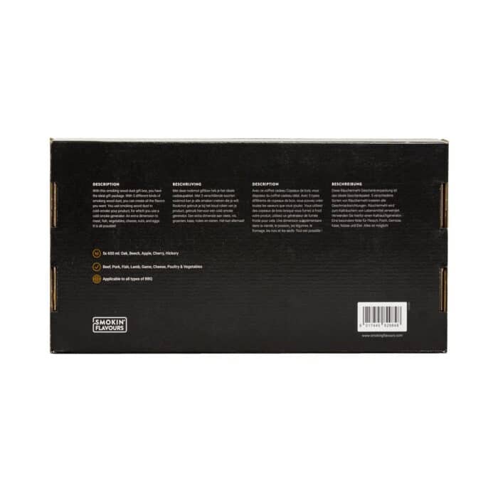 De Giftbox Rookmot 5 delig Smokin’ Flavours bevat 5 verschillende rooksnippers: eik, beuk, appel, kers en hickory. Elke variant zit in een 650 ml container.