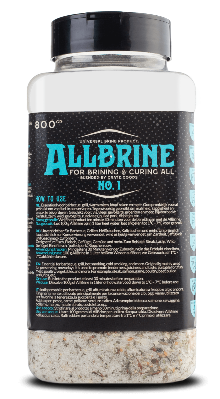 Voor het droog zouten of pekelen, moet je de Grate Goods AllBrine Nr.1 droog aanbrengen naar behoefte op het product. Het gezouten product moet je vervolgens gekoeld bewaren.