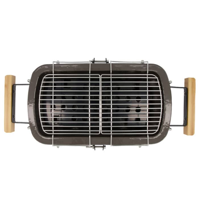 De volledig keramische body van de grill is geplaatst in een stevig metalen frame met een poedercoating dat ervoor zorgt dat je tafelblad niet beschadigd. Aan de zijkant zitten twee stijlvolle bamboe handvaten voor extra draaggemak. Zo kun je de grill overal mee naartoe nemen, hij weegt slechts 8 kilo!
