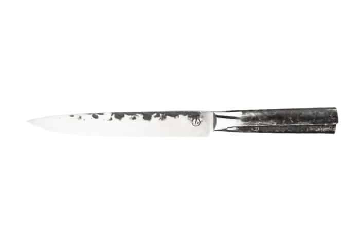 De Intense Forged Carving Knife heeft een gehamerde look, is handgesmeed van Japans staal, heeft een hardheid van 58 Rockwell, een lemmetlengte van 20,5 cm, een lemmetdikte van 2 mm en wordt verpakt in een luxe houten kistje. Het mes is niet vaatwasbestendig.