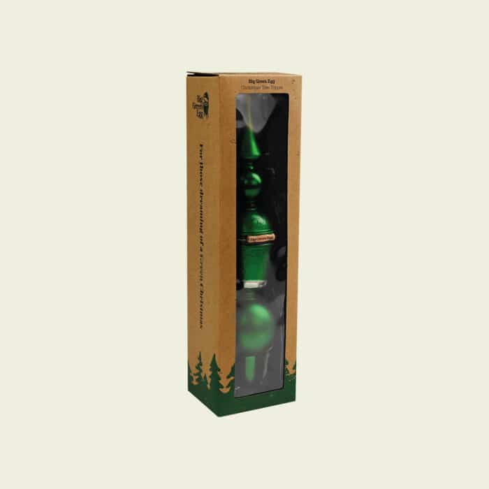 De Kerstboom piek Big Green Egg is verpakt in karton met een open venster.