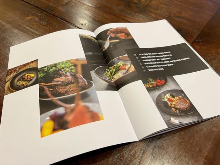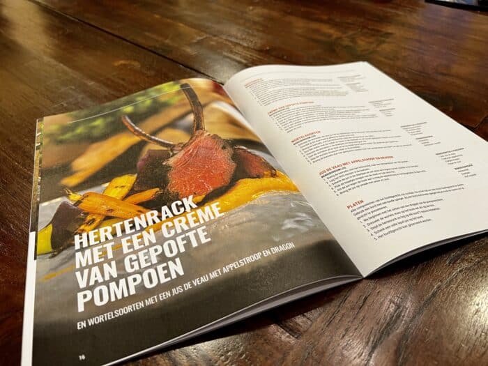 Het Hertenrack in het Kerstmenu 2021 magazine wordt geserveerd met een crème van gepofte pompoen en wortelsoorten. Dit wordt vergezeld van een jus de veau met appelstroop en dragon.
