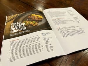 Het hoofdingrediënt van het eerste gerecht in het Kerstmenu 2021 magazine is Traag gegaard Oosters buikspek.