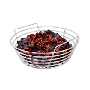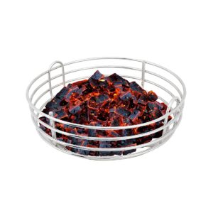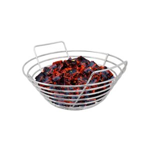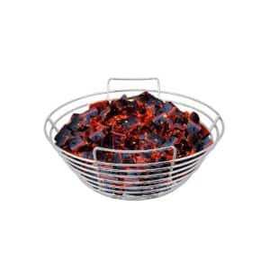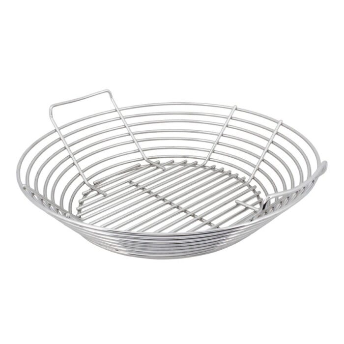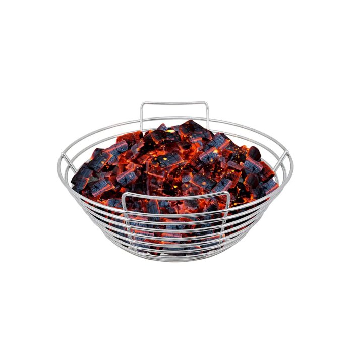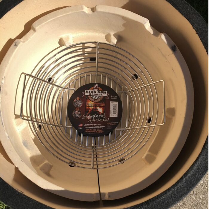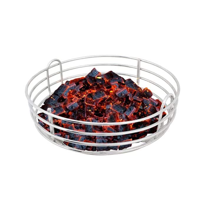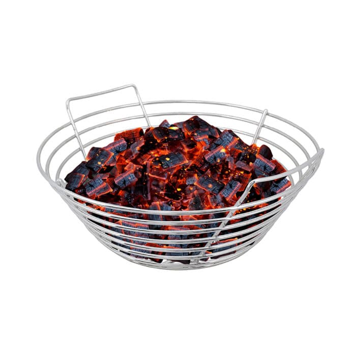 De Kick Ash Basket heeft drie voordelen. Ten eerste zorgt het voor meer luchtdoorstroming, waardoor je kamado sneller op temperatuur is en de temperatuur makkelijker te regelen is. Ten tweede kun je voor een nieuwe sessie eenvoudig het mandje eruit halen, het leegschudden boven een vuilniszak zodat alle kleine kolen en gruis door het rooster van het mandje vallen, en dan verse kolen erop gooien – je bent klaar! Tot slot kun je, indien nodig, ook gemakkelijk al je kolen vervangen door andere kolen om deze op de sessie af te stemmen.