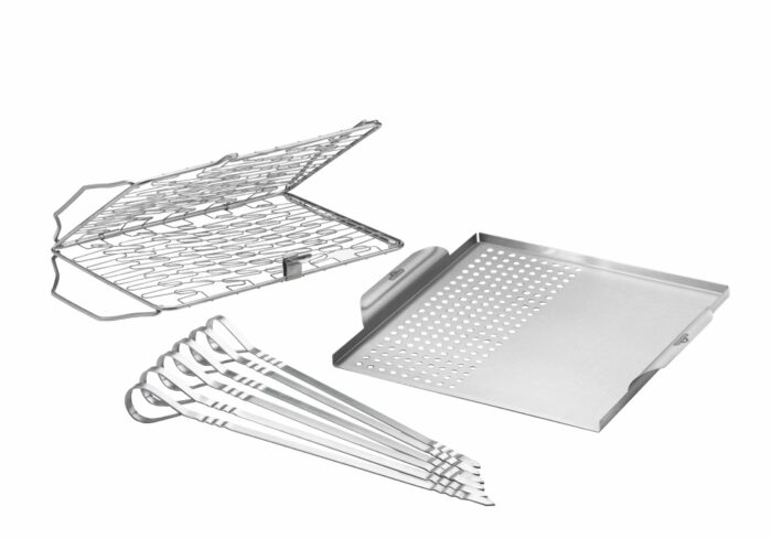 De Napoleon Healthy Choice startset is een set voor de BBQ die het mogelijk maakt om een houten plank aan te brengen voor die geweldige rooksmaak zonder te verbranden. In de set zitten ook herbruikbare RVS spiesen voor het maken van kebabs en een flexibele grillmand om delicaat voedsel zoals vis gemakkelijk van de grillroosters op te tillen.
