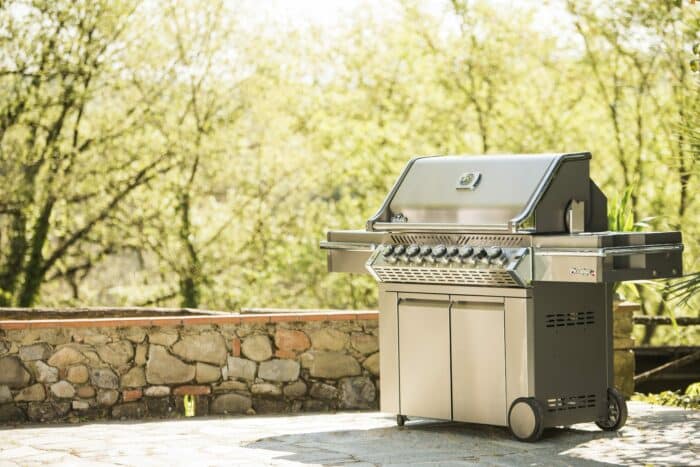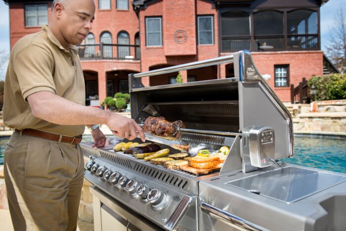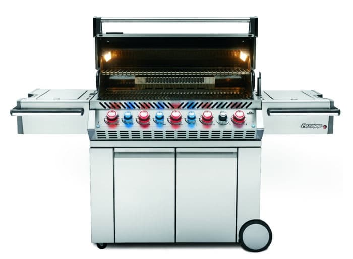 De Napoleon Prestige PRO™ 665 RVS RSIB is uitgerust met een geïntegreerde rook (smoker) lade, een luxe dubbele RVS warmteverdelers met JETFIRE-ontsteking, vijf robuuste RVS-branders en een zijtafel met geïntegreerde ijs-/marinadebak en snijplank.