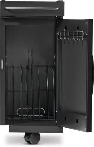 De zwenkwielen met rem zorgen ervoor dat alles soepel meebeweegt en daarna stevig op z’n plek blijft. Bovenin zit een lade voor je go-to tools, rubs of aanstekers, en slim detail: de handgreep van de lade is meteen een handdoekrek. Binnenin vind je een opbergdivider en tool hooks, zodat je spullen niet rondslingeren en je alles snel terugvindt.