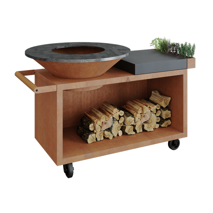 De OFYR Island PRO is de mobiele versie van de OFYR Island 100-100, uitgevoerd in cortenstaal en met een diepere basis. De Island PRO is geschikt voor gebruik op geplaveide oppervlakken. Het bestaat uit een stevig snijblok om voedsel op te bereiden en een handige houder voor accessoires. Onder het werkblad is een opslagruimte voor hout. Het snijblok is verkrijgbaar in teak hout en donkergrijs keramiek. De plank van teak moet u na gebruik binnenshuis opbergen, de plank van keramiek mag altijd buiten blijven