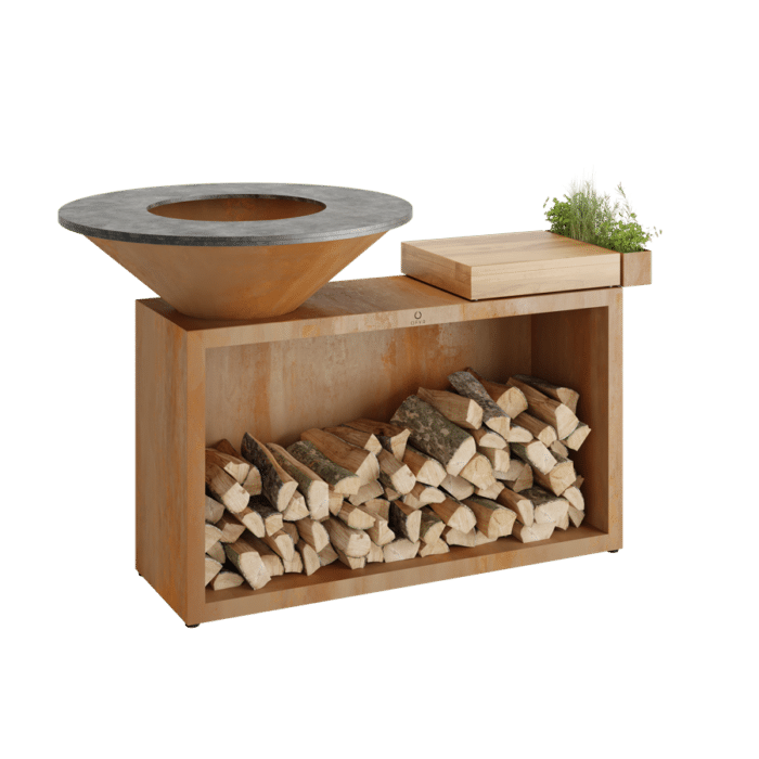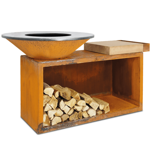 Het totale gewicht van de OFYR 85 Island Corten, Teak Hout is 168 kg. Het gewicht van alleen de kookplaat is 55 kg.