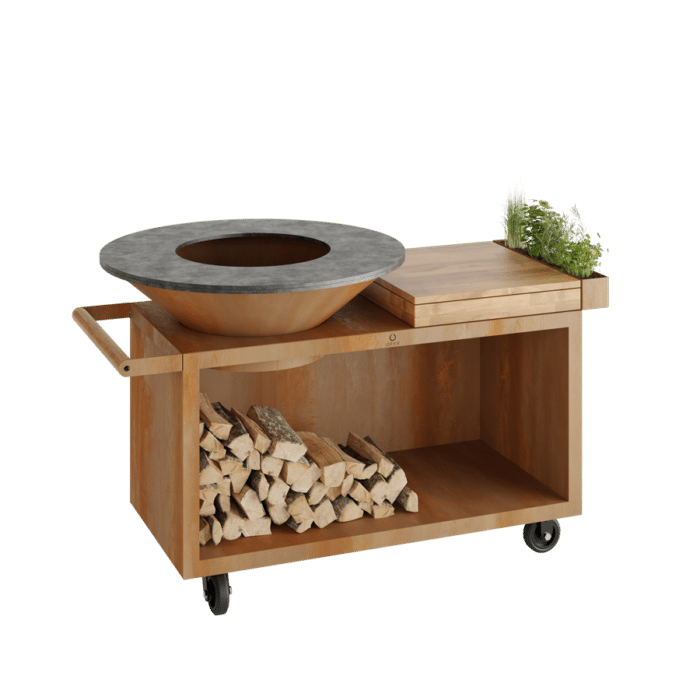 De OFYR Island PRO is de mobiele versie van de OFYR Island 100-100, uitgevoerd in cortenstaal en met een diepere basis. De Island PRO is geschikt voor gebruik op geplaveide oppervlakken. Het bestaat uit een stevig snijblok om voedsel op te bereiden en een handige houder voor accessoires. Onder het werkblad is een opslagruimte voor hout. Het snijblok is verkrijgbaar in teak hout en donkergrijs keramiek. De plank van teak moet u na gebruik binnenshuis opbergen, de plank van keramiek mag altijd buiten blijven.