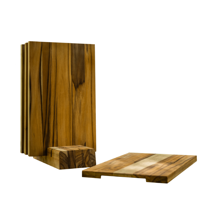 In de OFYR snijplank set zijn vier hoogwaardige snijplanken en een plankenstandaard inbegrepen.