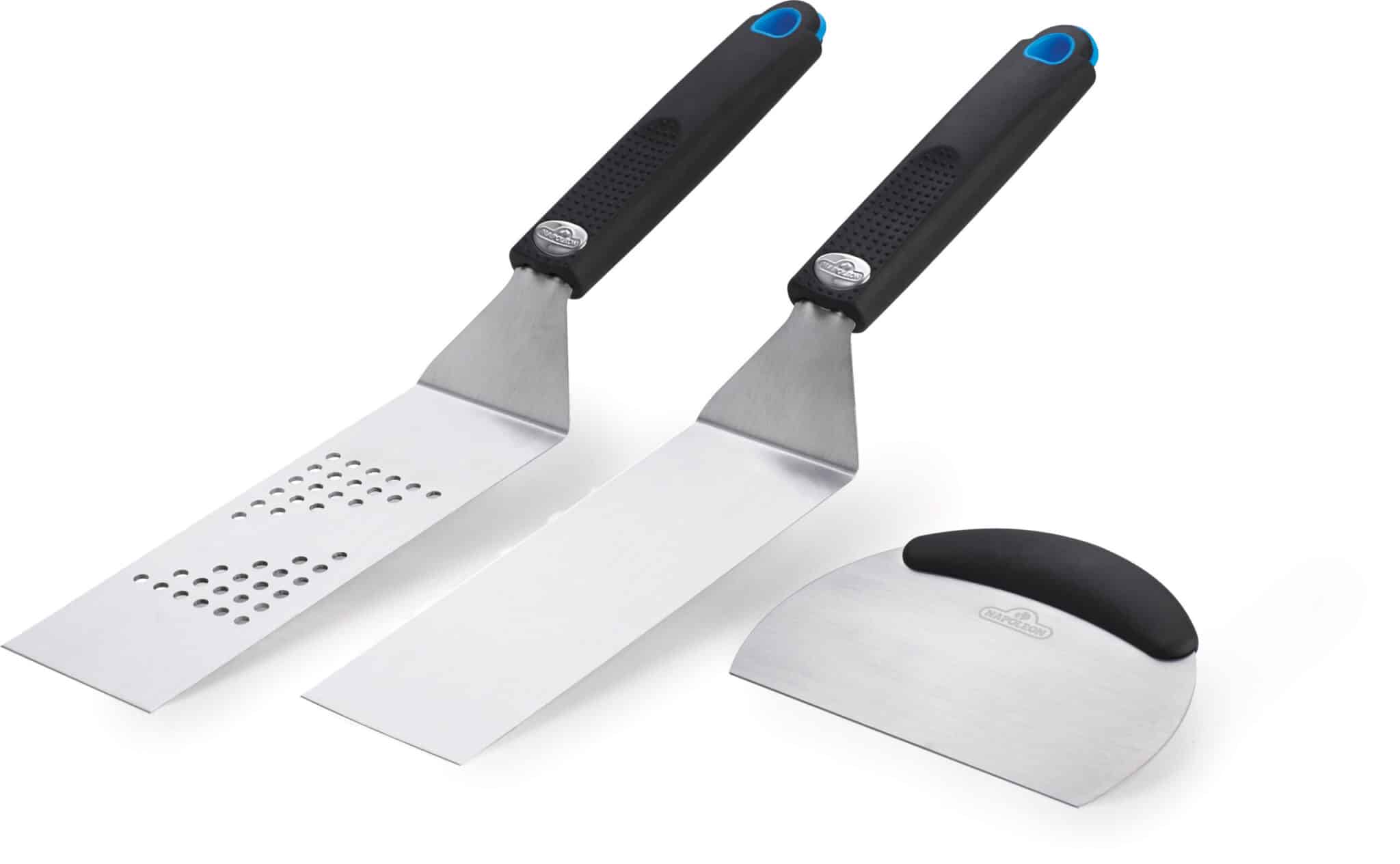 De Plancha gereedschapset 3-delig Napoleon bevat een geperforeerde spatel, een volledig dichte spatel en een schrapper.