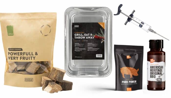 De Pulled pork bundel bestaat uit Angus & Oink – Pigasus 200g, BXC American heritage original bbq saus 250ml, Marinade injector Smokin’ Flavours, Aluminium bakken wegwerp groot 5 stuks Smokin’ Flavours, en Smokin’ Flavours rookchunks appel 1,5kg.