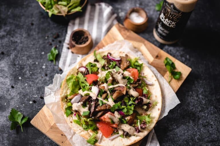 Aangezien iedereen zijn tortilla op een andere manier eet serveren we dit gerecht open op tafel. De ene houdt er namelijk van om ze op te rollen en de ander vouwt ze liever. Begin met een bord of plank en leg de tortilla’s erop. Smeer hier wat Black Garlic saus overheen. Deze is gemaakt van gefermenteerde knoflook en volledig plant based :). Verdeel de gemengde salade over de tortilla’s en mix de rode ui en tomaat over de sla. Neem de shawarma uit de pan en verdeel dit ook over de borden. Drizzle hier nog wat extra black garlic saus over. Je kunt nooit genoeg knoflook saus gebruiken 😉 Serveer direct en geniet ervan, opgerold of gevouwen.