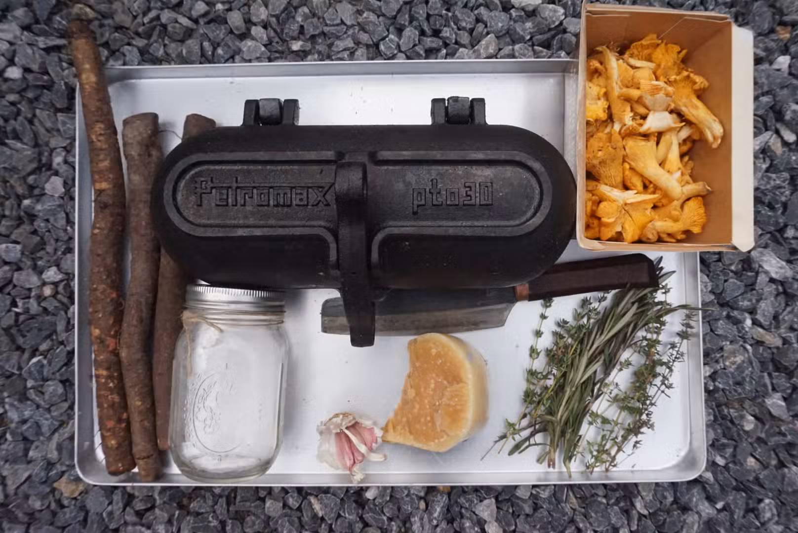 De benodigdheden voor het recept ‘Schorseneer uit het vuur’ zijn een gietijzeren aardappeloven, snijplank , koksmes, handschoenen en een dunschiller.
