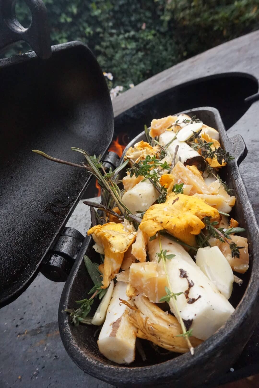 Het recept ‘Schorseneer uit het vuur’ bestaat uit 5 stuks schorseneer, 15 gram cantharelle, 9 gram oude kaas (24 maanden), 7 takjes rozemarijn, 5 takjes tijm, 2 teentjes knoflook, 2 eetlepels olijfolie, 1 eetlepel truffelolie, Peper en zout.