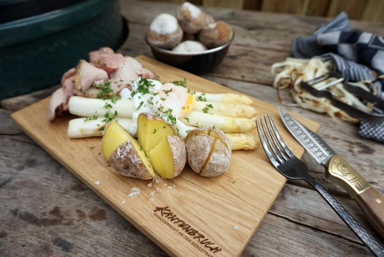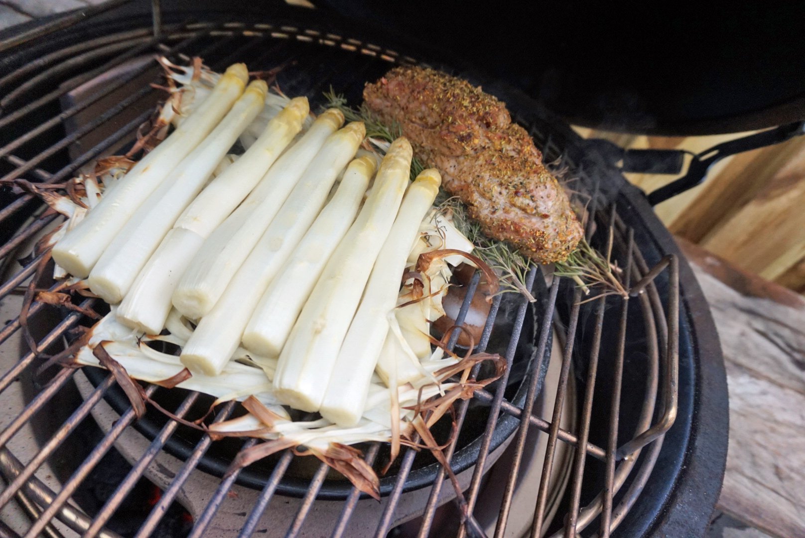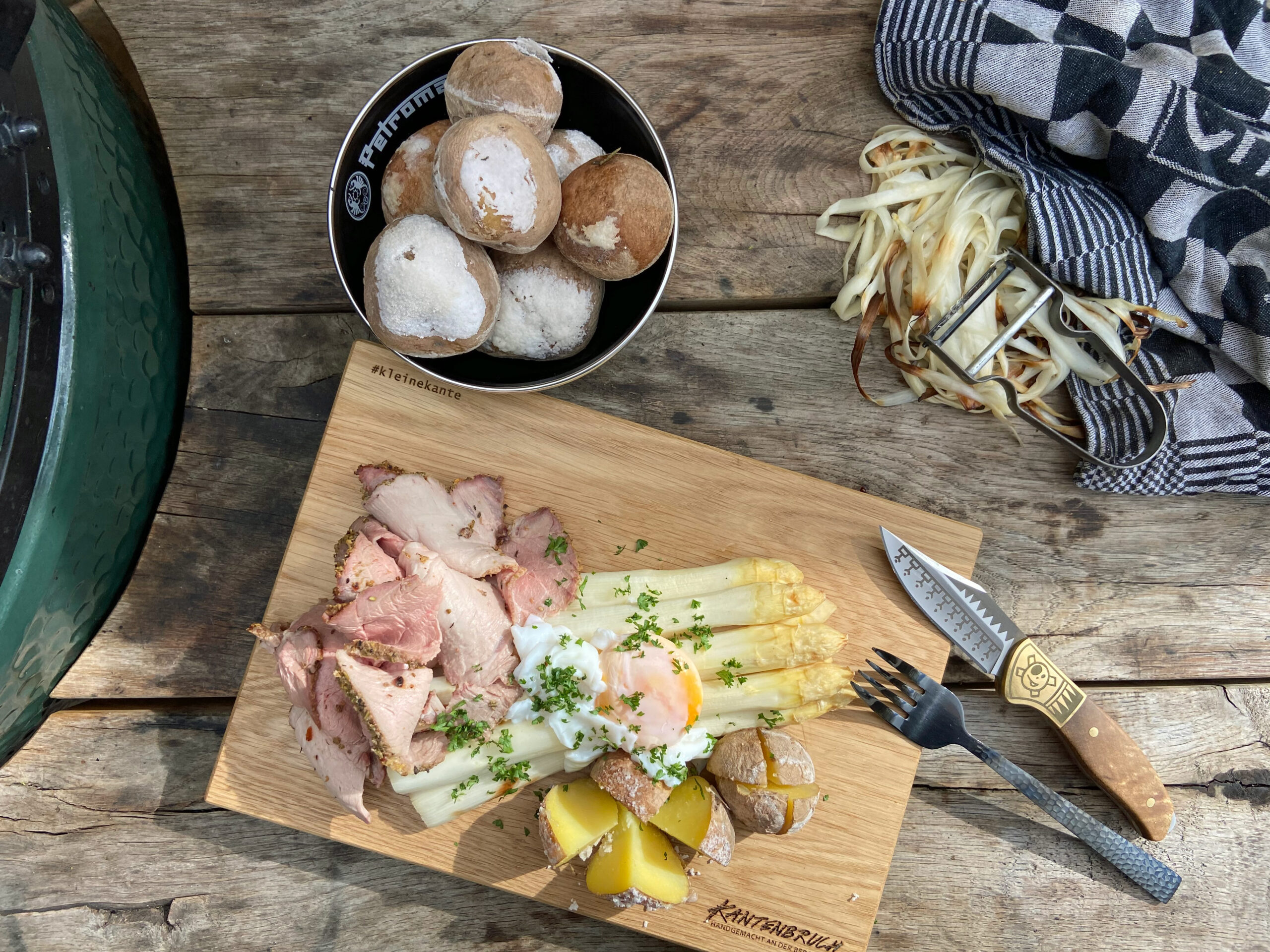 Voor het bereiden van het gerecht heb je een Plate setter (hitteschild), RVS rooster, Druippan, Koksmes, Snijplank, Aspergeschiller, Kookpannetje en een Garden nodig.