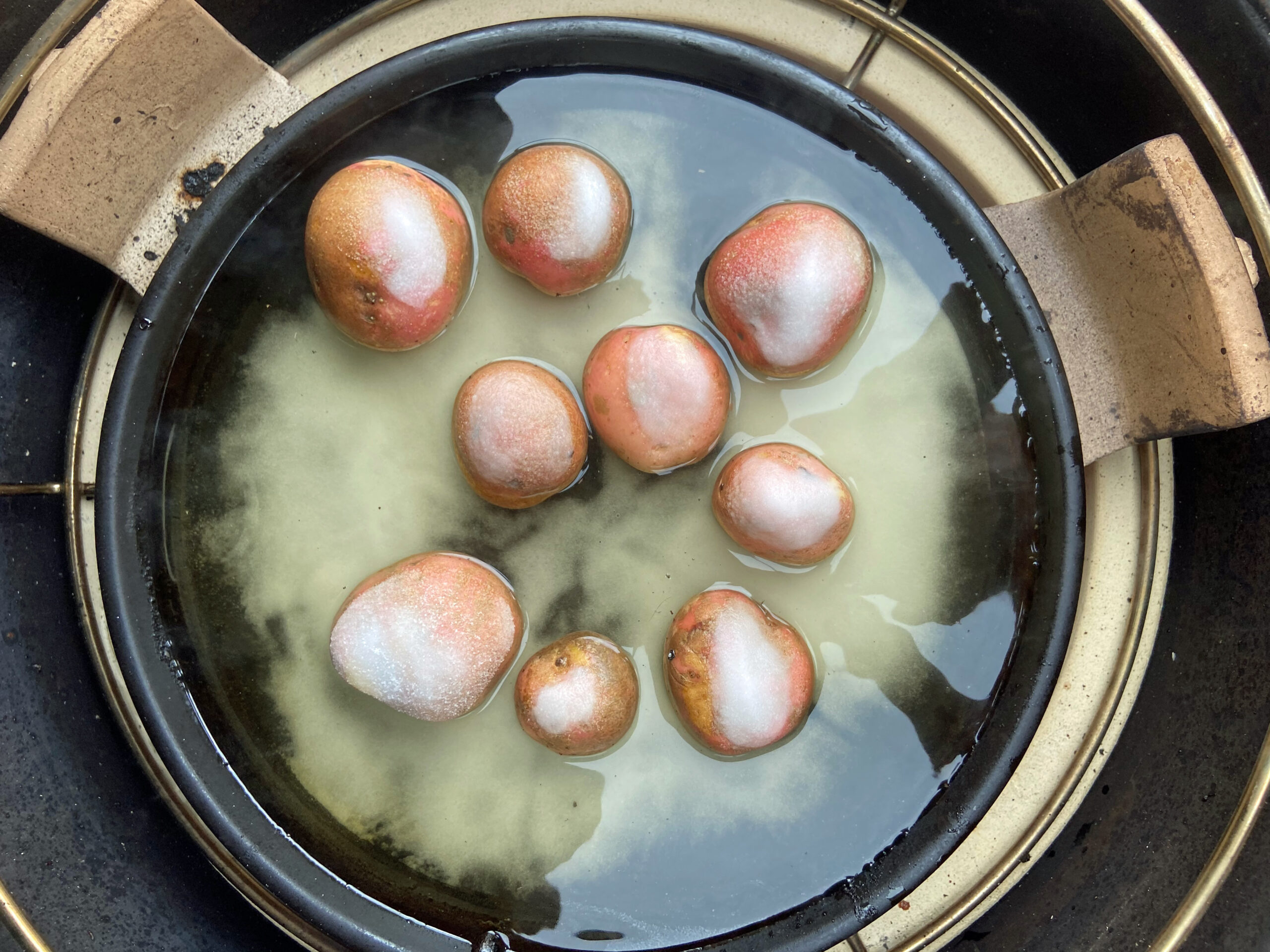 Je hebt de volgende ingrediënten nodig: 14 Asperges, 300 gram Procureur, 2 hele eieren, 30 gram Saus.Guru Orange Delight, 4 vastkokende aardappelen, 150 gram zout, 1 liter water, 12 gram krulpeterselie, 4 rozemarijn takjes, 6 tijm takjes en 30ml natuur azijn.