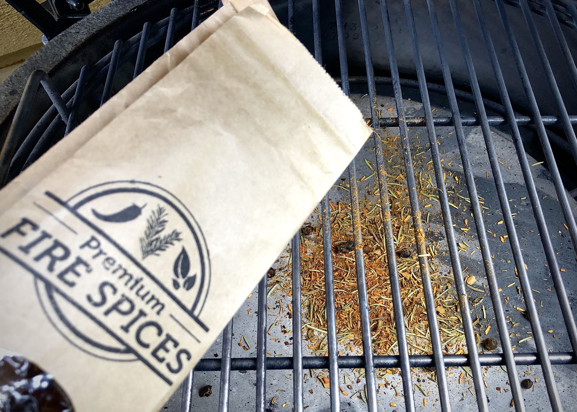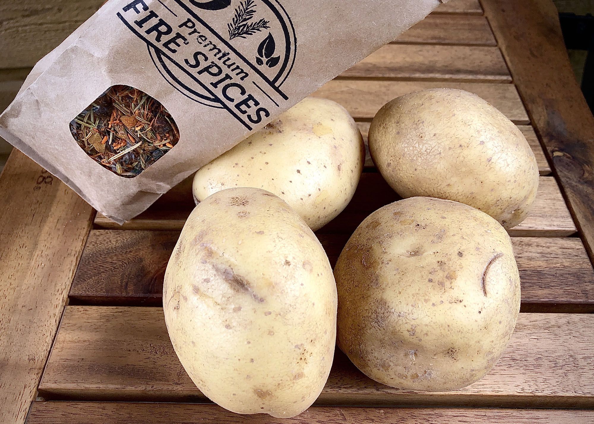 Prik wat gaatjes in de aardappels, dit zorgt ervoor dat stoom van binnenuit de schil niet laat scheuren en je later de ‘skins’ weer mooi kunt vullen. Strooi de vuurkruiden op de hete Plate Setter (deze gaan een lekker aroma afgeven aan je aardappels) of als je niet met een Plate Setter werkt strooi je de vuurkruiden op een stukje aluminium folie en zet je deze op de gloeiende kolen.
