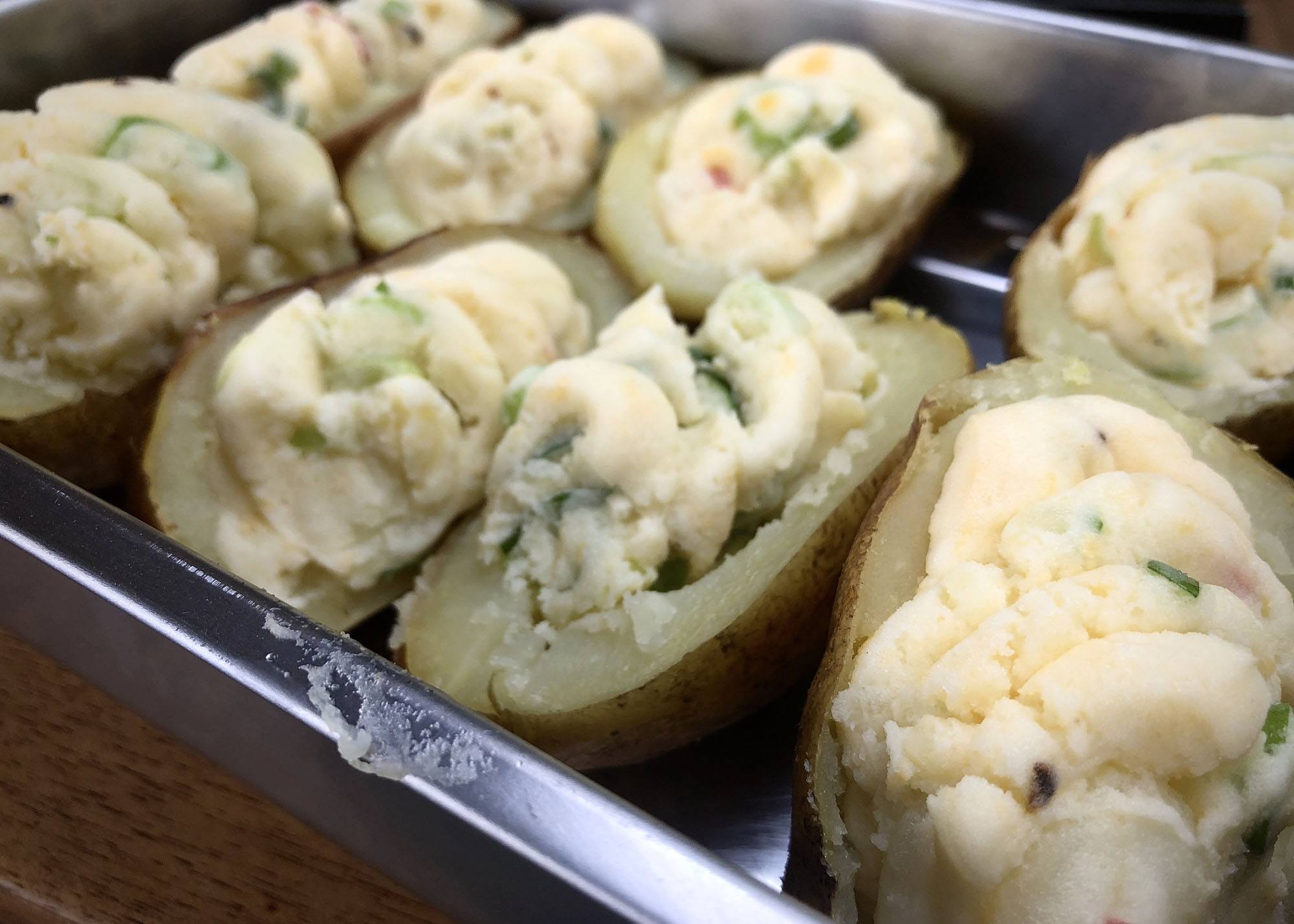 Zodra de aardappels op de barbecue liggen kun je beginnen met het voorbereiden van de vulling. Snijd de lente-uitjes in fijne ringetjes en rasp (als dit nog niet is gedaan) de cheddar kaas. Als de aardappels gaar zijn snijd je ze over de lengte doormidden. Schraap met een lepeltje de gare binnenkant eruit en vang op in een kom. Zorg wel dat je nog een klein laagje aardappel aan de schil laat zitten zodat deze zijn stevigheid behoudt.