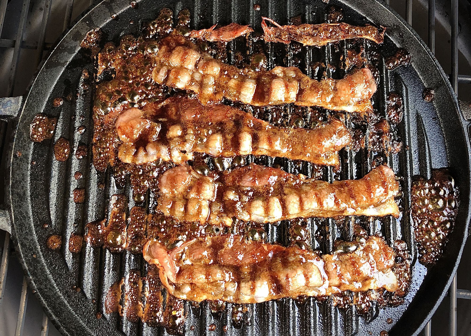 De ultieme combinatie van zoet en zout! Dát is Candied Bacon. Verhit een gietijzeren skillet op de barbecue. Leg hierin de plakken spek. Meng de bruine suiker en ahornsiroop en kwast dit met behulp van een basting brush over het spek. Draai het spek om en kwast nogmaals in.