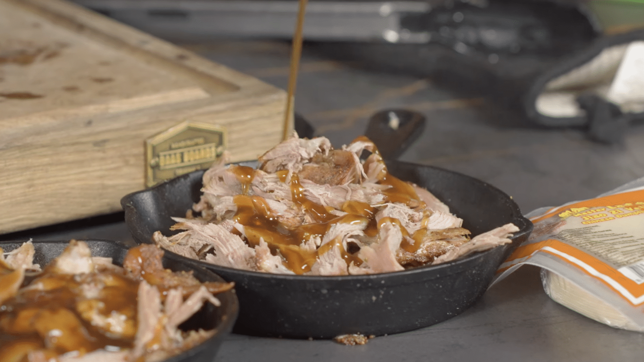 De huid is nu nog vrij zacht, dus die haal je er af en houd je even apart. Deze bak je straks mooi krokant uit. Deze eendenborst is al voorgegaard, dus na een uurtje in de BBQ kan je deze gaan plukken. Doe dit wel met handschoenen aan, want ze zijn nog vrij warm. Als het vlees is geplukt, doe je de Magic Five van Saus.Guru erbij.