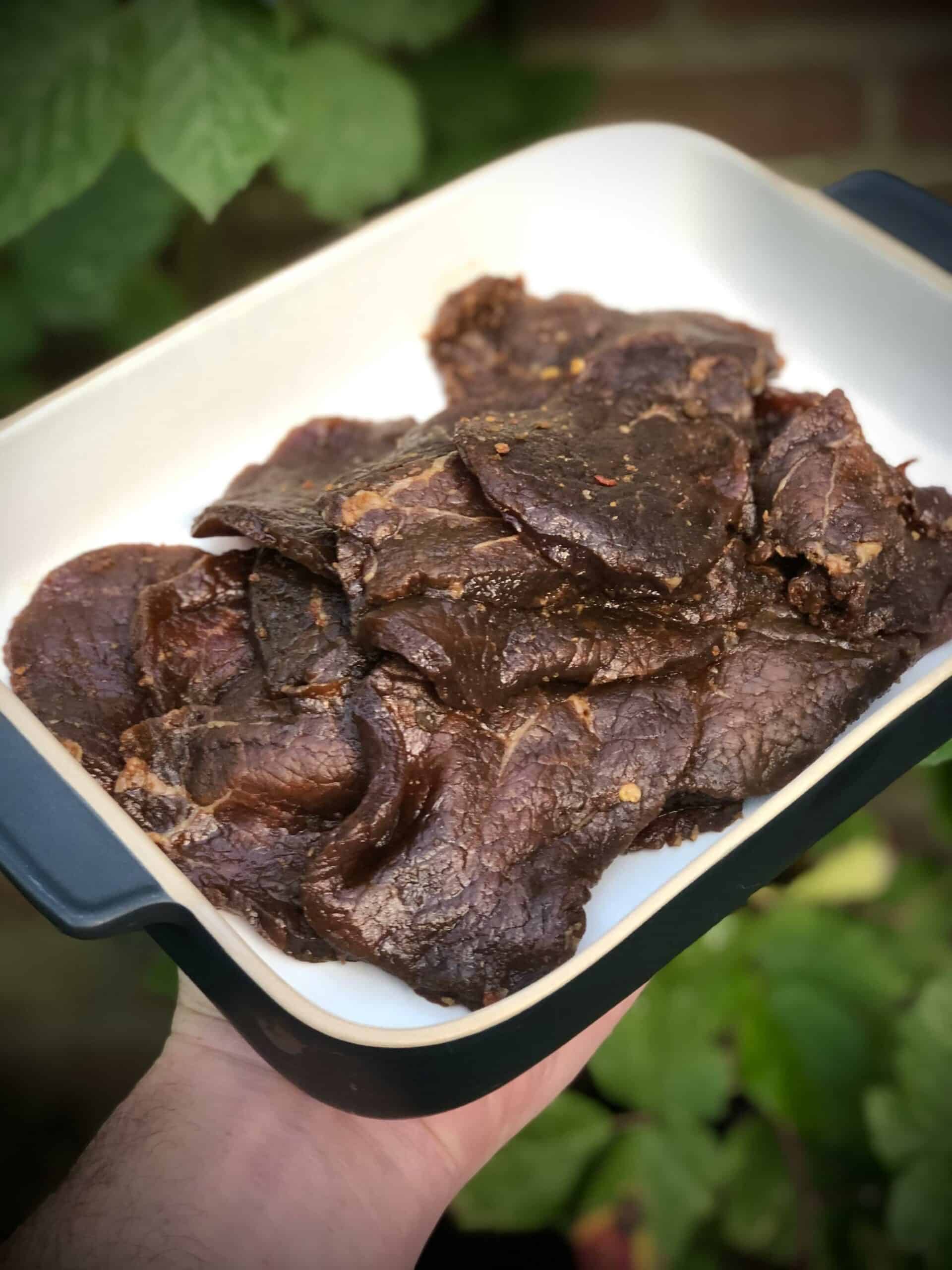 De Beef jerky mag rustig afkoelen in de schaal. Daarna mogen ze uiteraard direct op tafel gezet worden, maar het makkelijke van deze snack is dat ze in een pot in de koelkast nog dagenlang houdbaar zijn. Enkele weken kunnen ze houdbaar zijn, maar dat halen ze doorgaans nooit. De donkere kleur, de smaak en de textuur maken het tot een originele snack op iedere gezellige avond.