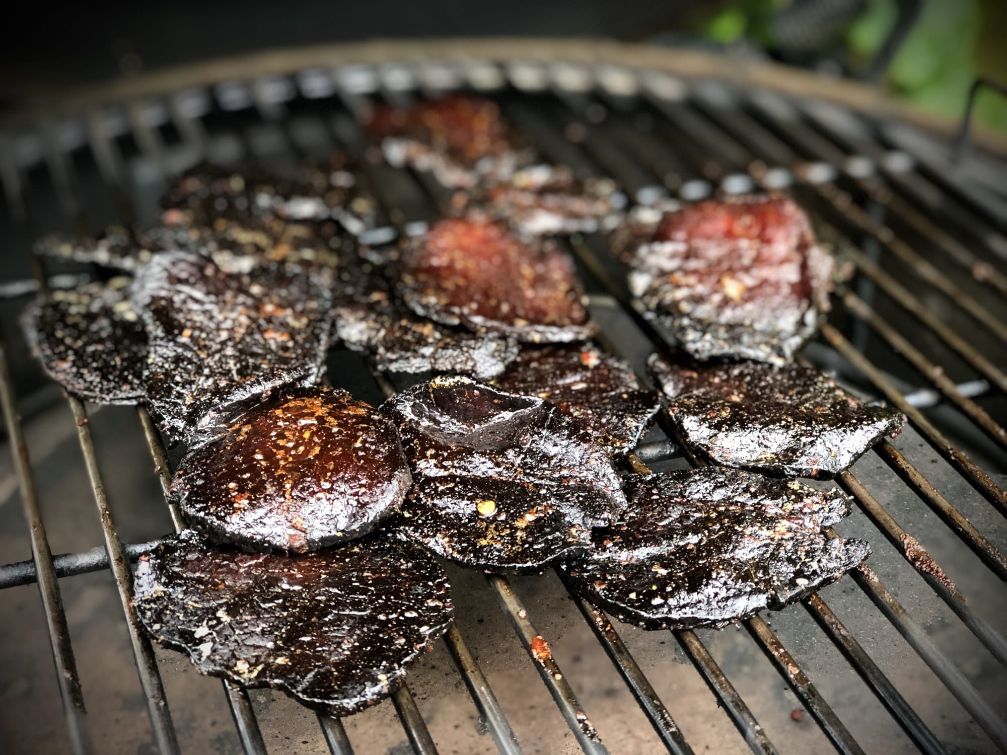 Verdeel nu de plakken beef jerky op het grillrooster en zorg er voor dat ieder stuk vrij ligt. Sluit de kamado en laat het geheel de komende uurtjes rond de 80-100 graden garen. Uiteindelijk zal de Beef jerky “mooi” zwart worden en dat zal in de meeste gevallen rond de 3,5 tot 4,5 uur kunnen duren. Tussendoor controleren mag dus én snuif dan meteen de heerlijke geur uit de barbecue op.