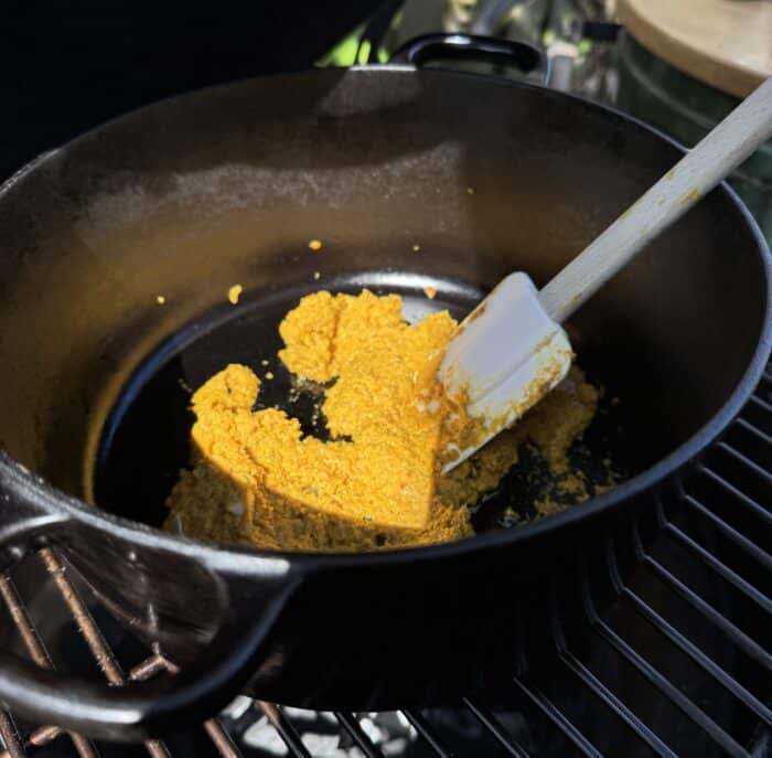 Terwijl je kamado en je dutch oven op temperatuur komen kun je de riblappen in blokjes snijden. Verhit een scheut arachideolie in de pan en zet hierin je in stukjes gesneden riblap op aan. Zorg dat het vlees mooi bruin wordt, want dat geeft veel smaak af aan je gerecht. Voeg hierna de boemboe toe en bak deze enkele minuten samen met het vlees mee.