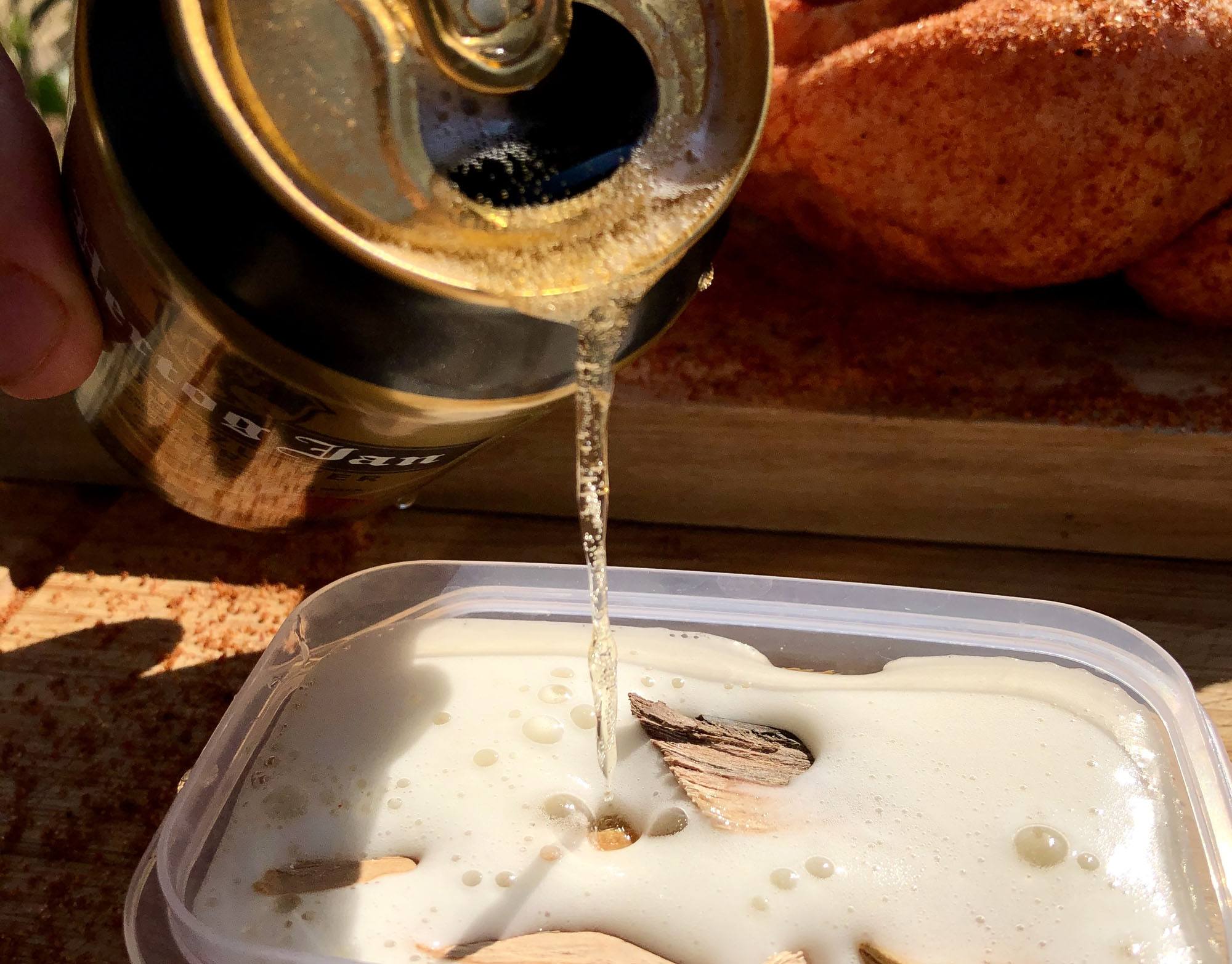 Doe een flinke hand rookhout snippers in een bakje. Maak het blikje bier open en neem eerst zelf een flinke slok. Heb je geen bier in huis dan werkt bijvoorbeeld een blikje cola ook prima. Schenk ongeveer de helft van de inhoud van het blikje over de houtsnippers en laat ze even weken. Doe een handje rub in het blikje. Dit zal wat gaan schuimen in eerste instantie maar dat is niet zo erg. Zet de kip op het blikje en steek de poten iets naar voren zodat hij stabiel op drie punten leunt.