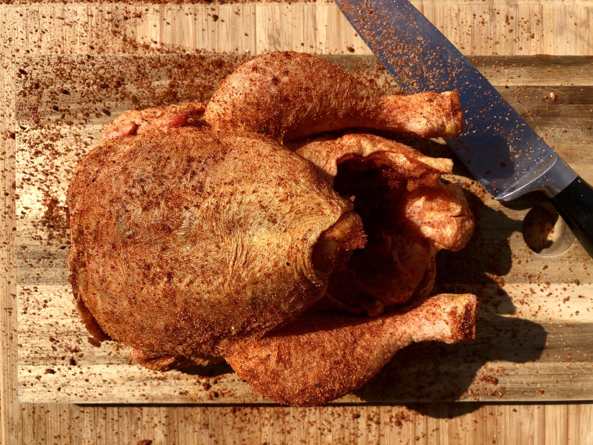 Snijdt nekvel, en loshangend vet weg. Wrijf je kip goed in met de rub, zorg ook dat je goed onder het vel rubbed. Zo krijgt niet alleen het velletje een lekkere smaak, maar ook je vlees. Het vel trek je rustig en beheerst los van het vlees zodat je er gemakkelijk met je hand tussen kan om de kruiden overal aan te brengen.