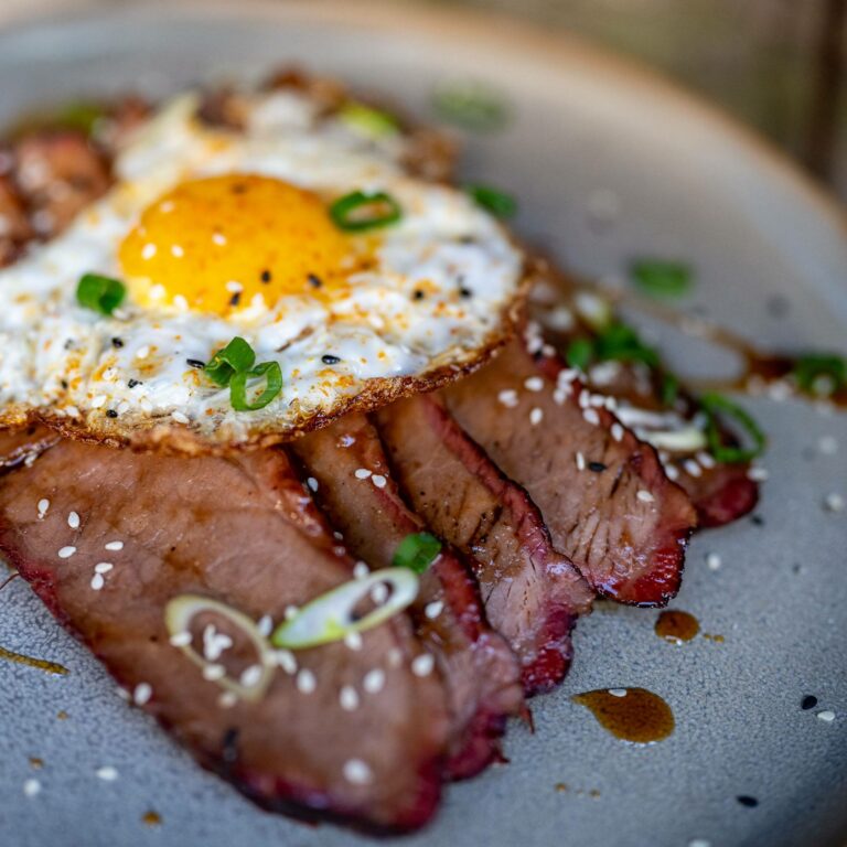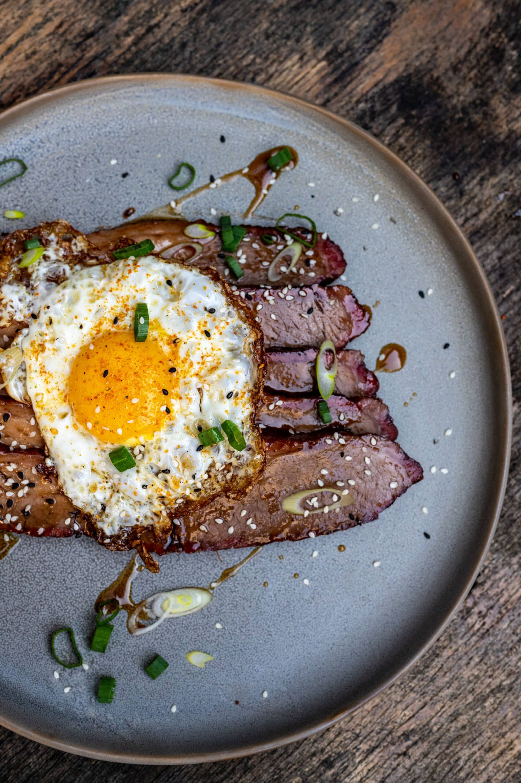 Snij dunne plakken brisket op een bord. Bak intussen een sunny side up eitje. Besmeer de plakken met een lik Black Mojo en leg het eitje op het vlees.. Garneer met sesam en fijngesneden bosui en een flinke draai uit de pepermolen. Beter kan je zondag niet beginnen!
