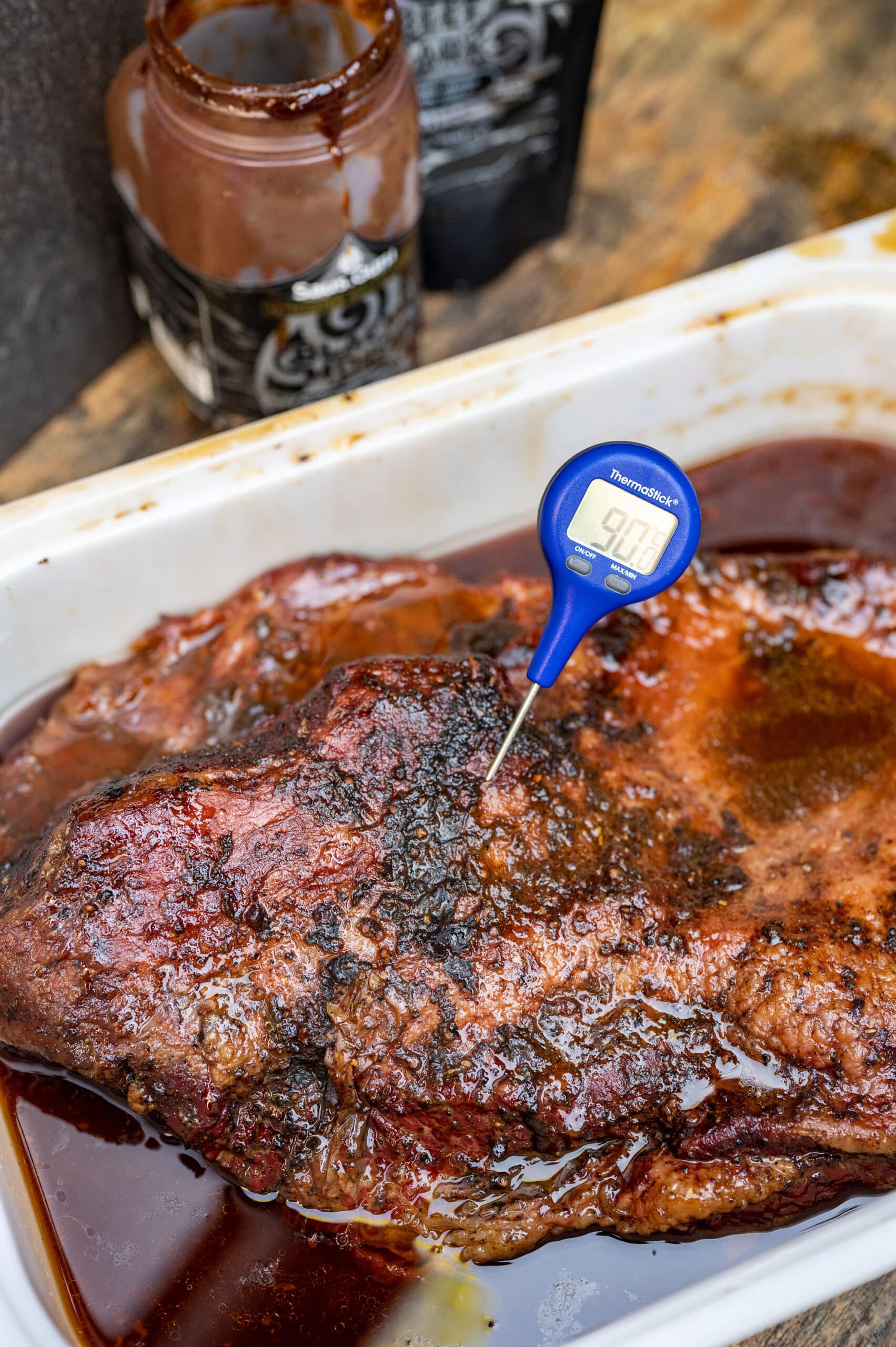 Als de kern van de brisket 92 graden is kan je de brisket er vanaf halen en minimaal een half uur laten rusten voor je hem gaat snijden. Pas op met hete bouillon die tijdens het uitpakken kan vrijkomen.