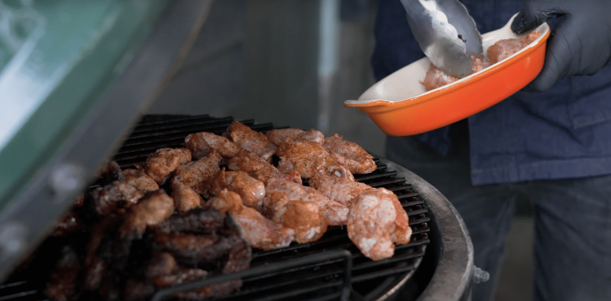 Wanneer de ribfingers ongeveer een half uurtje op het rooster liggen, kunnen de kippenvleugels erbij. Deze gaan we eerst even halveren. Je kan ze precies halveren door het scharnier die in het midden van de kippenvleugel zit door te snijden. Zo krijg je mooie kleine tv-sticks. Vervolgens rubben wij deze sticks met de Korean Heat, een lekkere pikante rub die vooral lekker is bij kip. Deze plaatsen we bij de ribfingers voor wederom een half uurtje, voordat we de gehaktballetjes er op leggen.