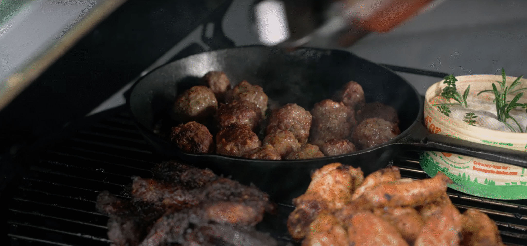 Wanneer de kip erop ligt, gaan we beginnen met de Italiaanse gehaktballen. Je doet eerst je skillet op het rooster en verwarmt deze voor. Terwijl je de skillet voorverwarmt, ga je beginnen aan de gehaktballetjes. Hiervoor gebruiken we grof rundergehakt en daar gaat wat Gaucho rub op en voeg de overige ingrediënten toe en kneed je het door tot een mooi egaal en stevig mengsel. Draai vervolgens mooie egale gehaktballetje van het gehaktmengsel. Voeg vervolgens een scheut olie toe aan de inmiddels opgewarmde skillet en bak hier vervolgens de balletjes voor ongeveer 20 minuten. Schud de balletjes om de 10 minuten om zodat ze rondom mooi bruinen en egaal garen. De temperatuur van de kamado blijft op 150 graden indirect.