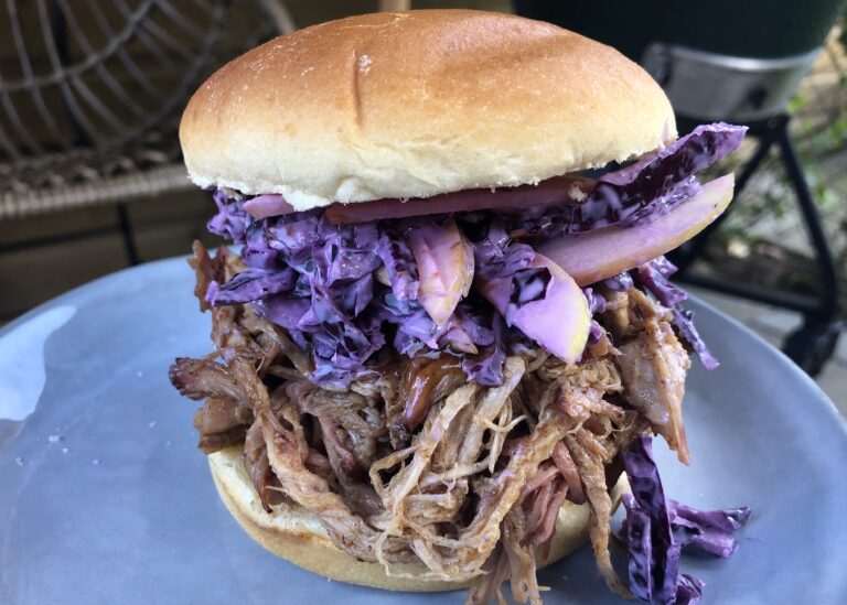 Brioche broodje pulled pork met rode kool appel salade