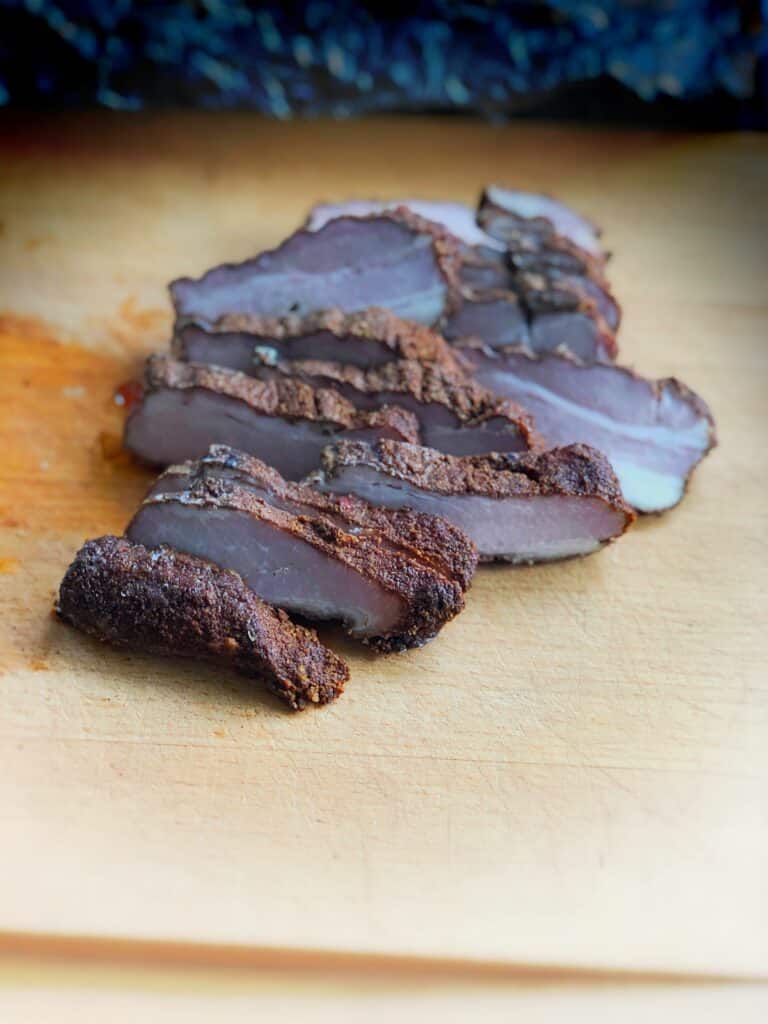 Voor het broodje dat we gaan maken hebben we aan 250 gram buikspek genoeg. Meer mag uiteraard ook, want het komt toch wel op. Ik adviseer om een goede voorraad meerdere stukken buikspek te garen. Het vlees is na het warm roken goed terug te koelen en daarna in te vriezen. Zo kun je in de komende periode een dag er voor het vlees laten ontdooien in de koelkast. Daarna is het een kwestie van snijden en grillen.