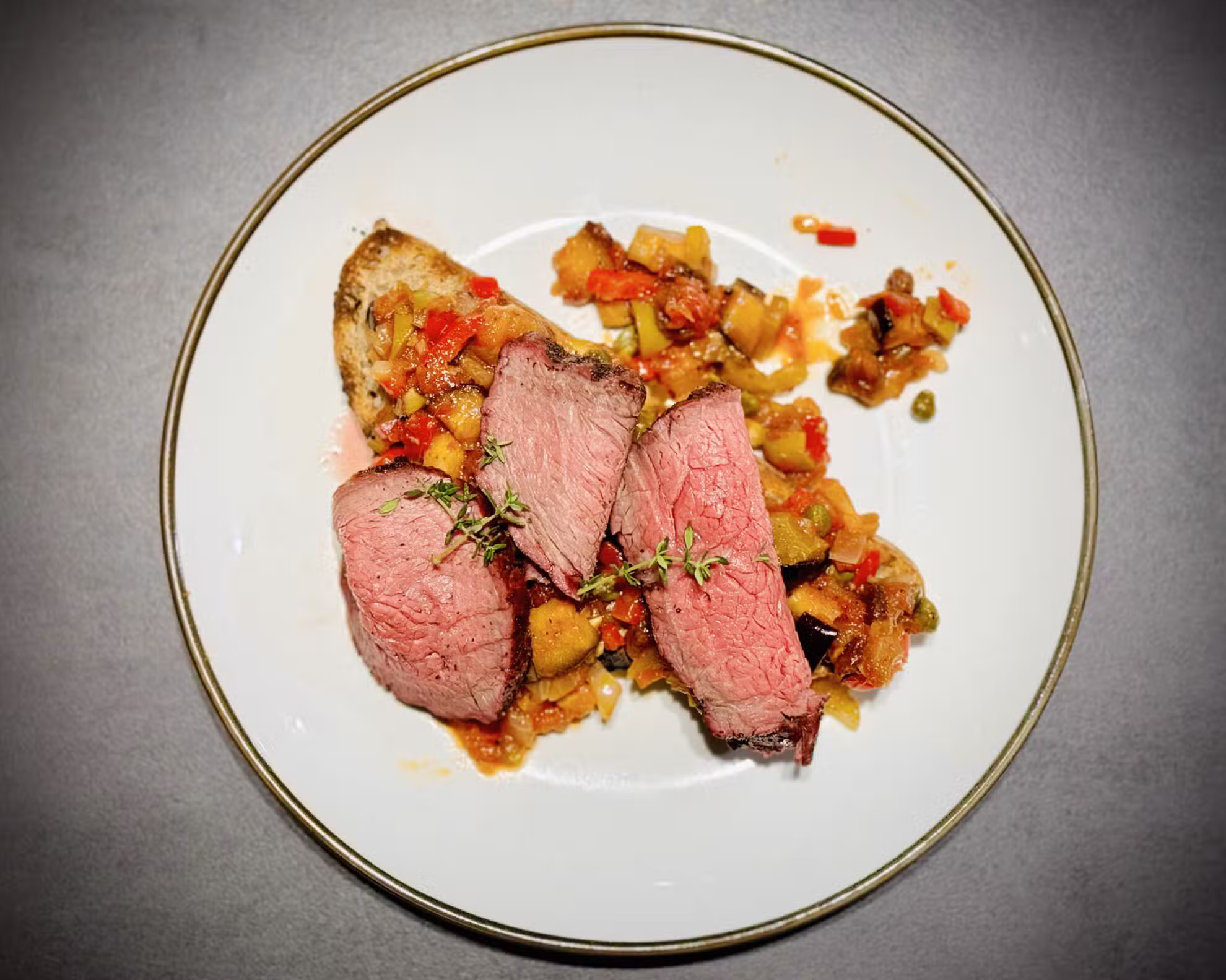 Serveertip: Voor de opmaak van de borden schep je de Italiaanse caponata op het getoast brood. Leg hier bovenop je getrancheerd vlees en top het geheel af met fijn gesneden verse tijm en geroosterde pijnboompitten.