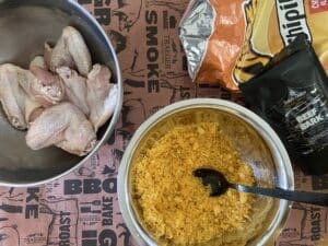 Het recept voor de Cheetos chicken wings bestaat uit 500 gram kippenvleugels, 60 gram Cheetos, je favoriete BBQ rub en 10ml olijfolie.